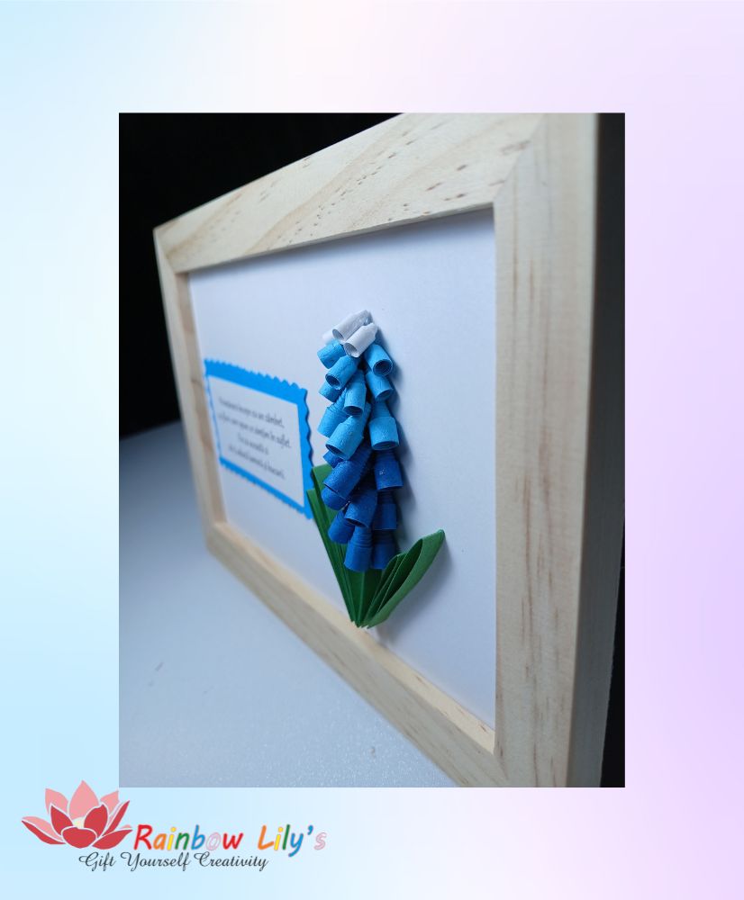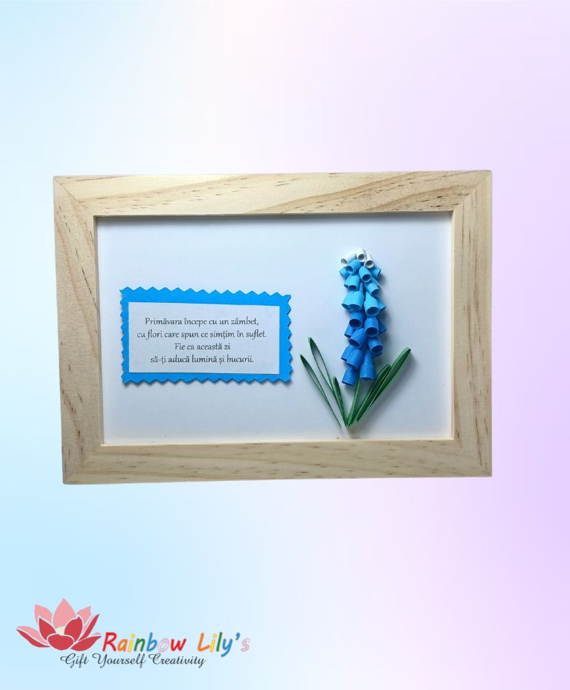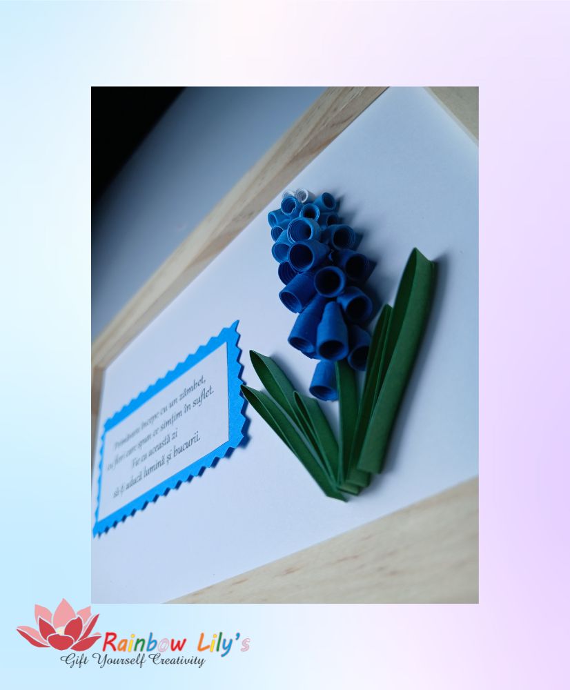Aceas tablou  decorativ realizată manual este creată pentru a transmite emoție, recunoștință și delicatețe. Florile sunt realizate prin tehnica quilling. O metodă artistică mai puțin cunoscută, care oferă un efect 3D elegant și vizibil. Transformă fiecare piesă într-un mic tablou cu personalitate.