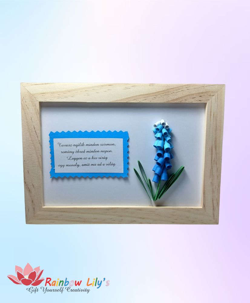 Tablou handmade în ramă din lemn (10 × 15 cm), decorată cu floare realizată prin tehnica quilling, cu efect 3D. Ideală pentru 8 Martie sau cadouri cu mesaj personalizat, în română sau maghiară.