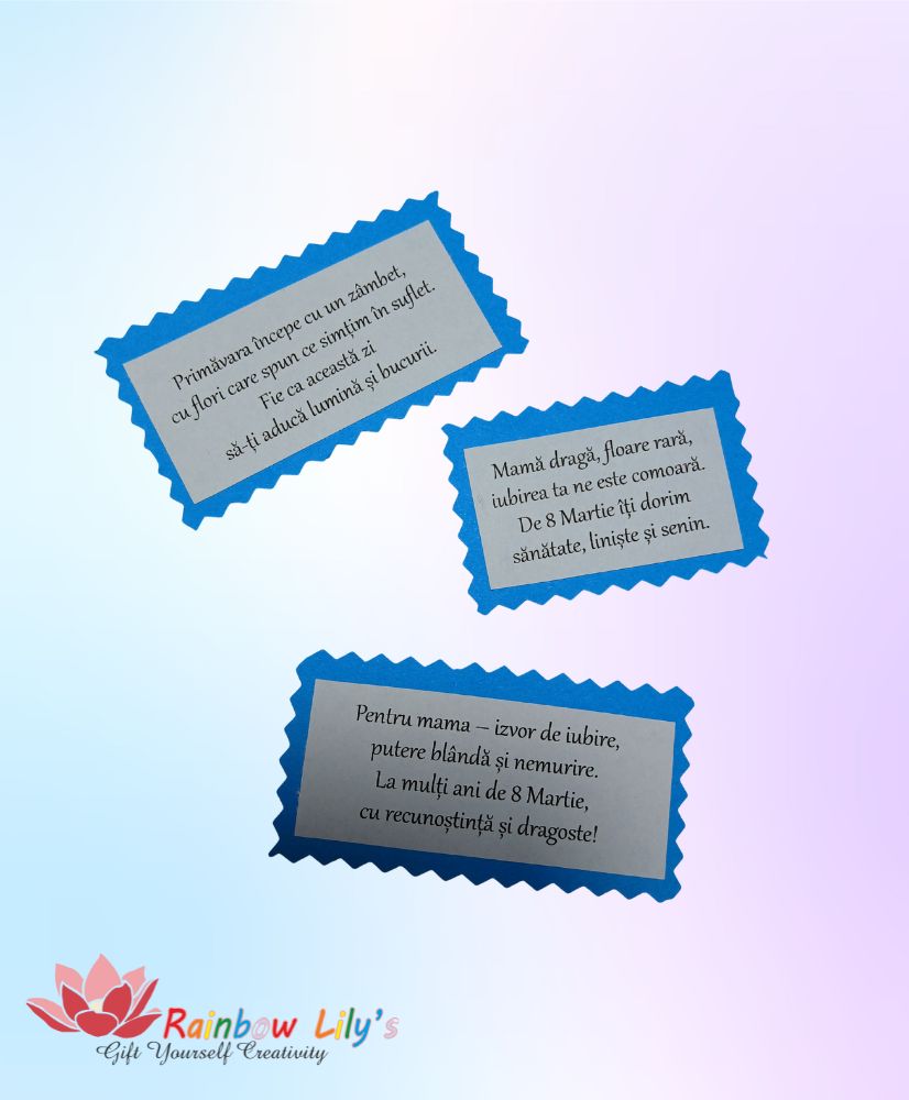 Este o alegere inspirată pentru 8 Martie, Ziua Mamei sau orice moment în care dorești să oferi un mesaj sincer și special. Fiecare felicitare este însoțită de un cartonaș în culori armonizate cu floarea aleasă, pe care se poate adăuga un text personalizat, în limba română sau maghiară.