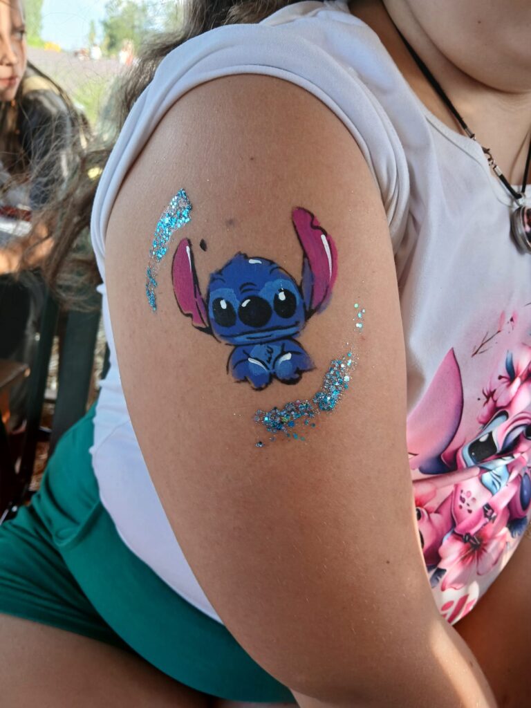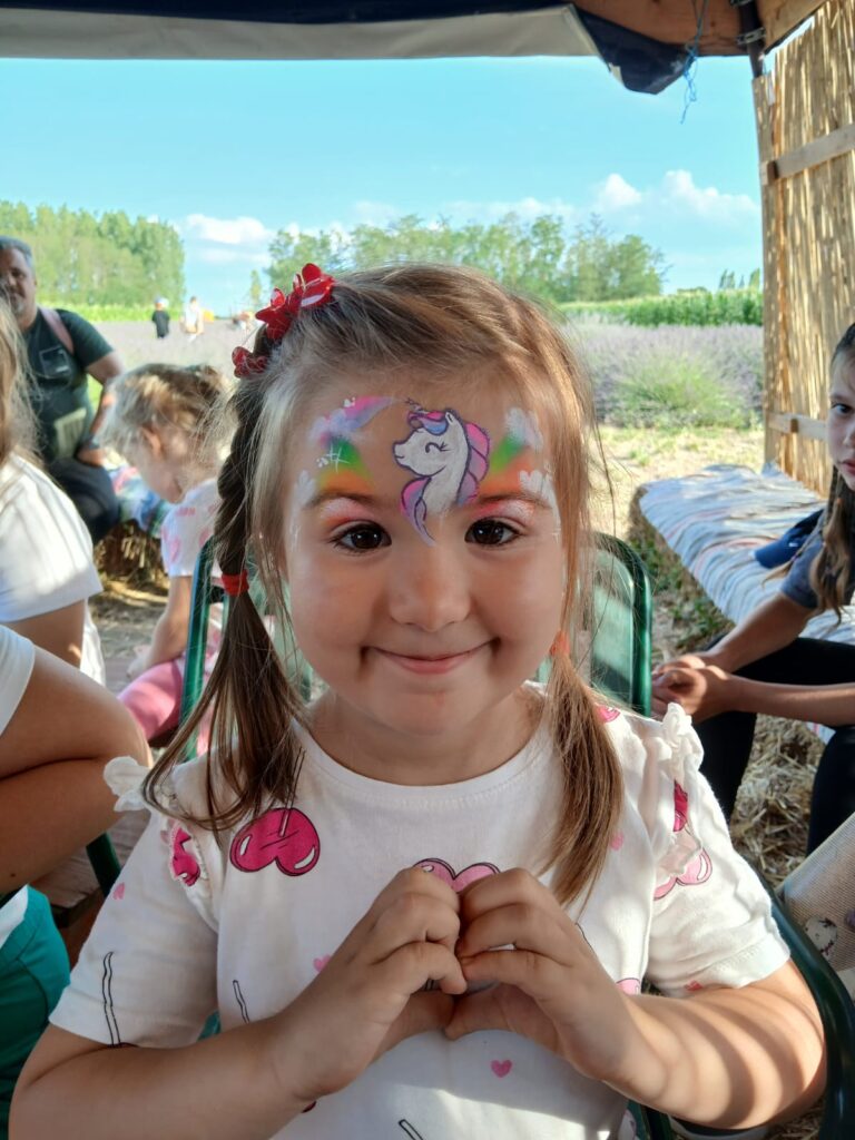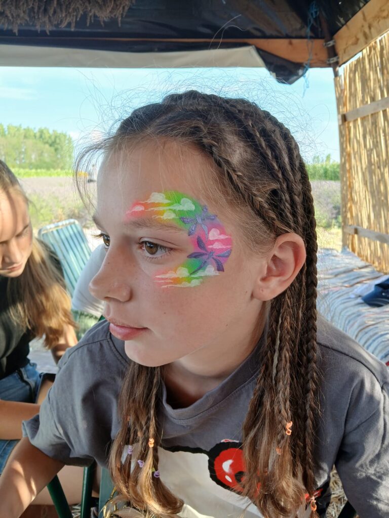 Toate acestea la un loc, într-un loc de poveste, ar fi îndeajuns. Totuși pot spune că punctul pe i a fost dată de pictura pe față 🙂 Copii nerăbdători își așteptau rândul la o pictură pe față, tatuaj cu sclipici sau codițe. DA! Chiar pentru toate lucrurile au fost entuziasmați.Cele mai căutate culori au fost cele de curcubeu desigur 🙂 iar transformarea a fost strălucitoare. Au fost perechi de copii sau mamă-fiică care și-au ales pictura sau tatuajul identic. O fetiță a venit doar ca să își primească codițele mult așteptate de culoare albastru închis, culoarea trupei preferate. La sfârșitul zile am fost și eu plină de sclipici (ca de obicei 😀)